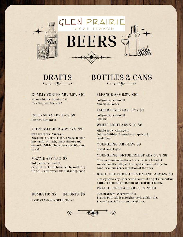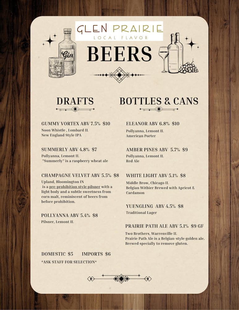 Glen Prairie is proudly a scratch kitchen, items are subject to change upon availability